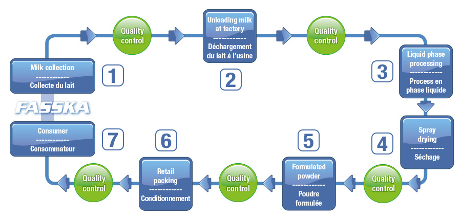 Our production process consists of seven essentials steps ranging from the milk collection at the farms until the finalization of the formulated product. These steps are located on the same production site that guarantees the freshness of our finished products. Our main process is situated at step n°4, the spray drying on Multi Stage Dryer.